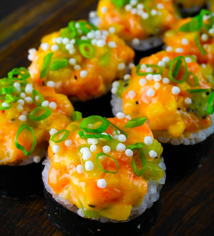 Состав: Нори, рис, творожный сыр, охлажденная семга, спайси соус, киви, огурец, манго. Подается с зеленым луком и рисовыми шариками.