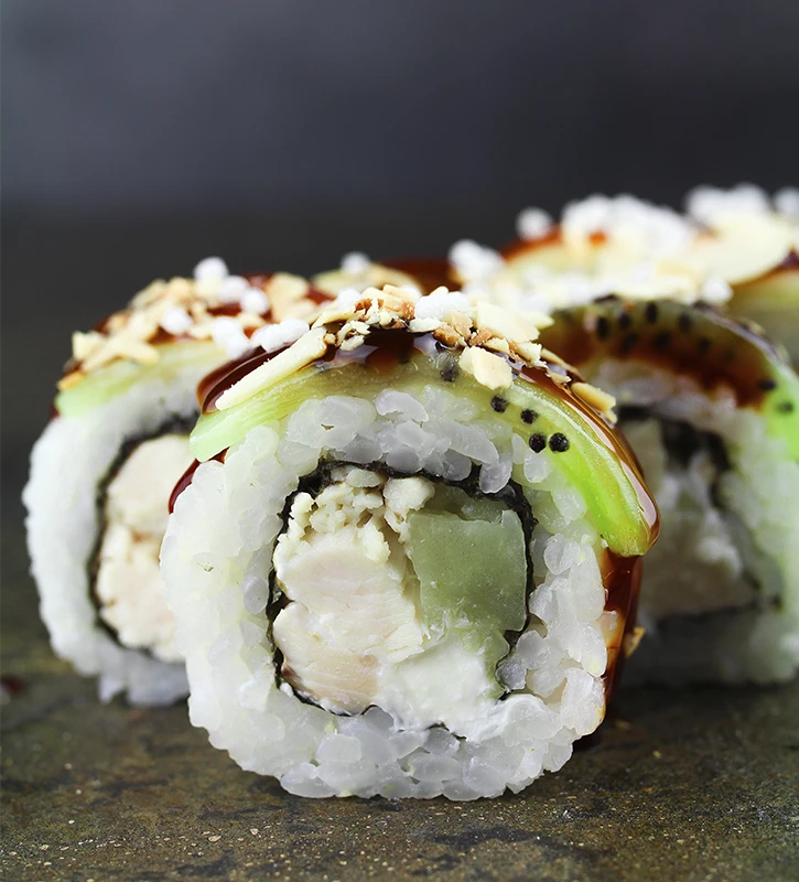 Рис для суши, нори, творожный сыр, куриное филе, ананас, киви. Подается с миндалью, рисовыми шариками и в соусе унаги.