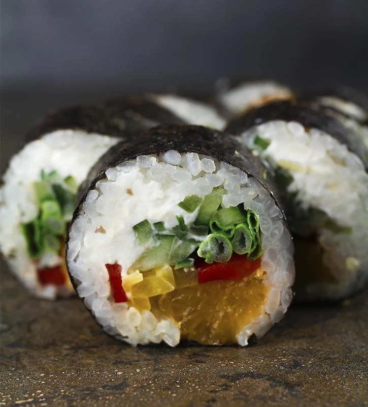 Рис для суши, нори, творожный сыр, огурцы, зеленый лук, болгарский перец, дайкон, мандарин, кунжутное масло.
