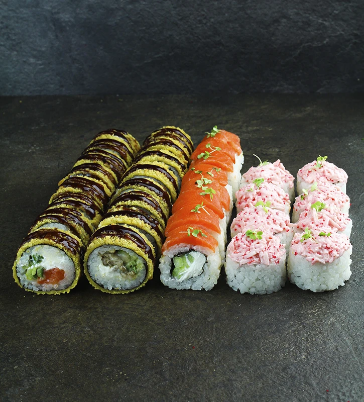 Филадельфия лайт - 8 шт., тартар с крабом - 8 шт., темпура с лососем - 8 шт., темпура с угрем - 8 шт. Всего 32 шт.