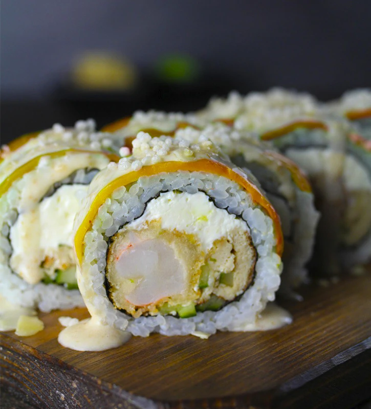 Состав: нори, рис, творожный сыр, батат, омлет, креветка. Подается с ореховыми соусом и рисовыми шариками.