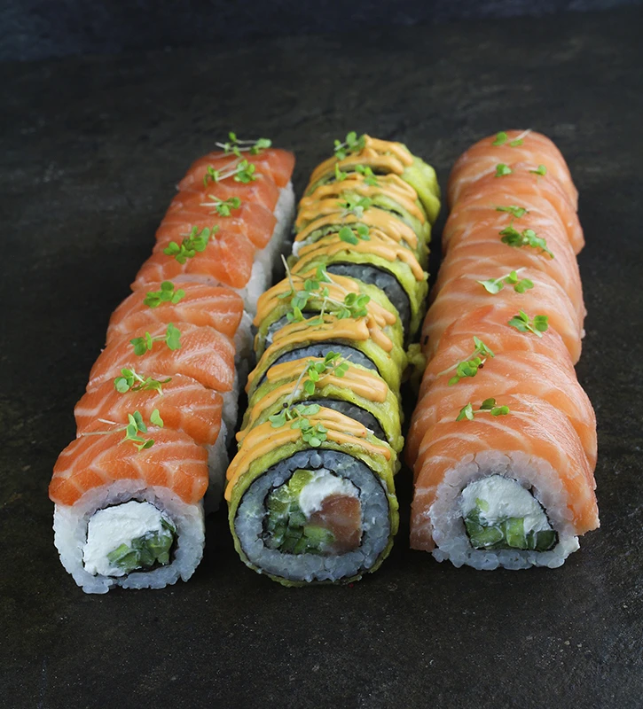 Премиум Филадельфия классик - 8 шт., премиум темпура с лососем - 8 шт., премиум Филадельфия лайт - 8 шт. Всего 24 шт.